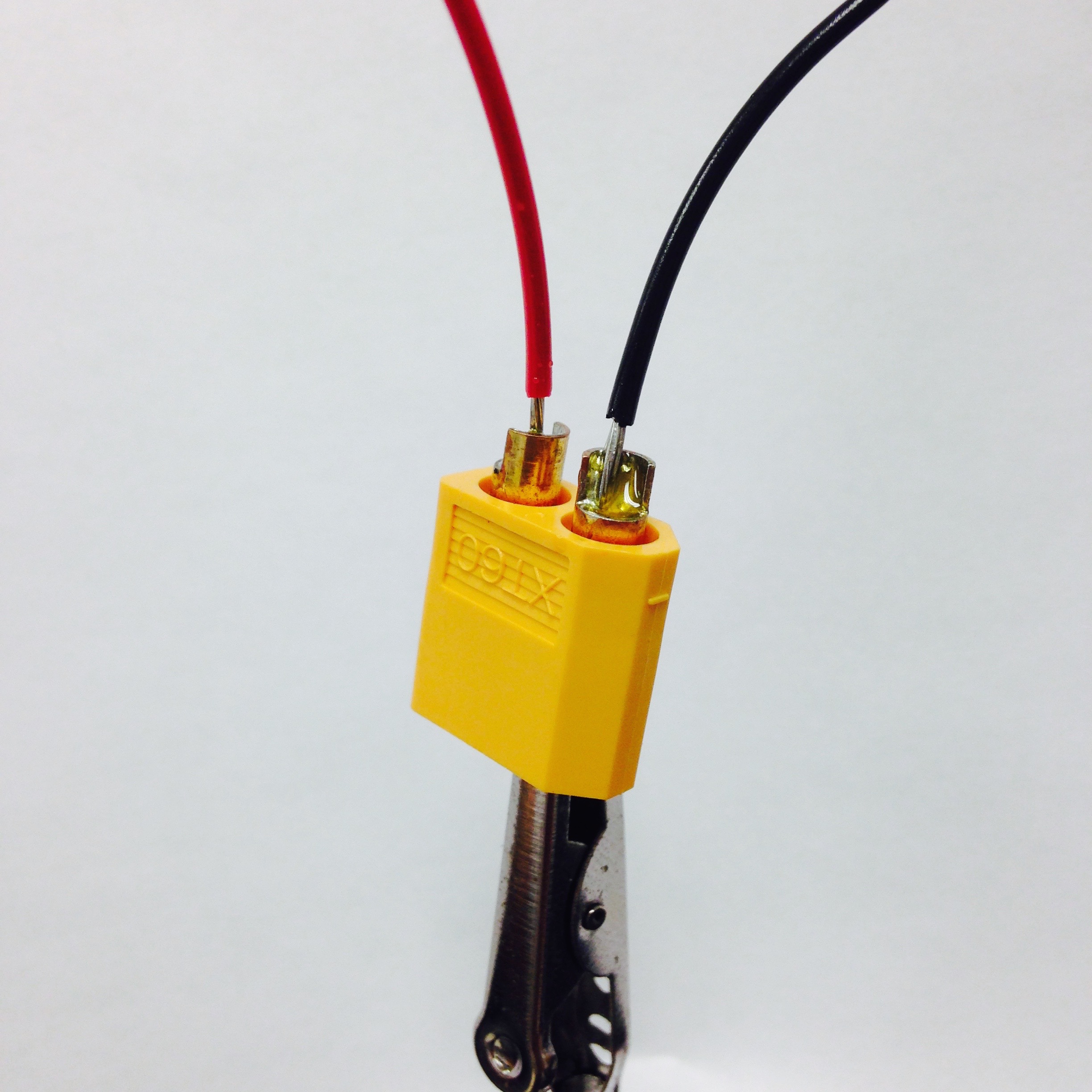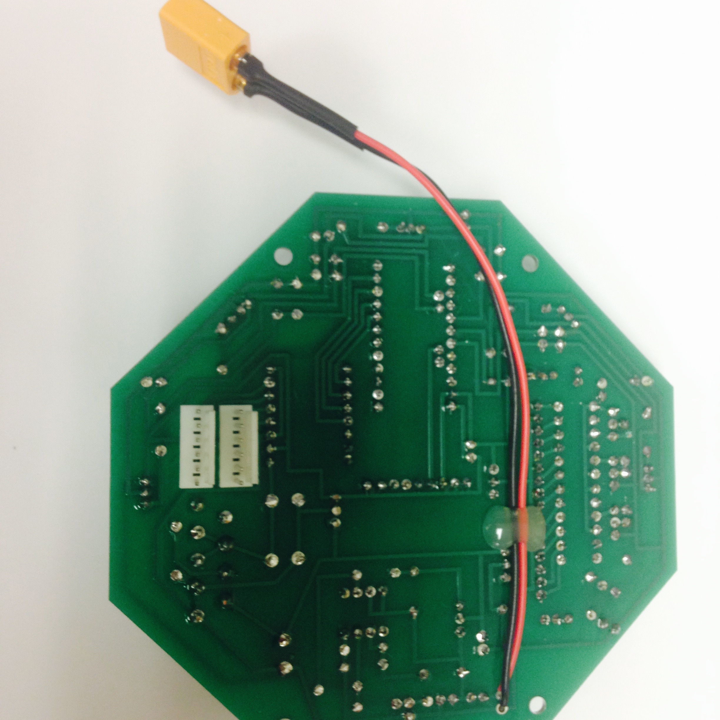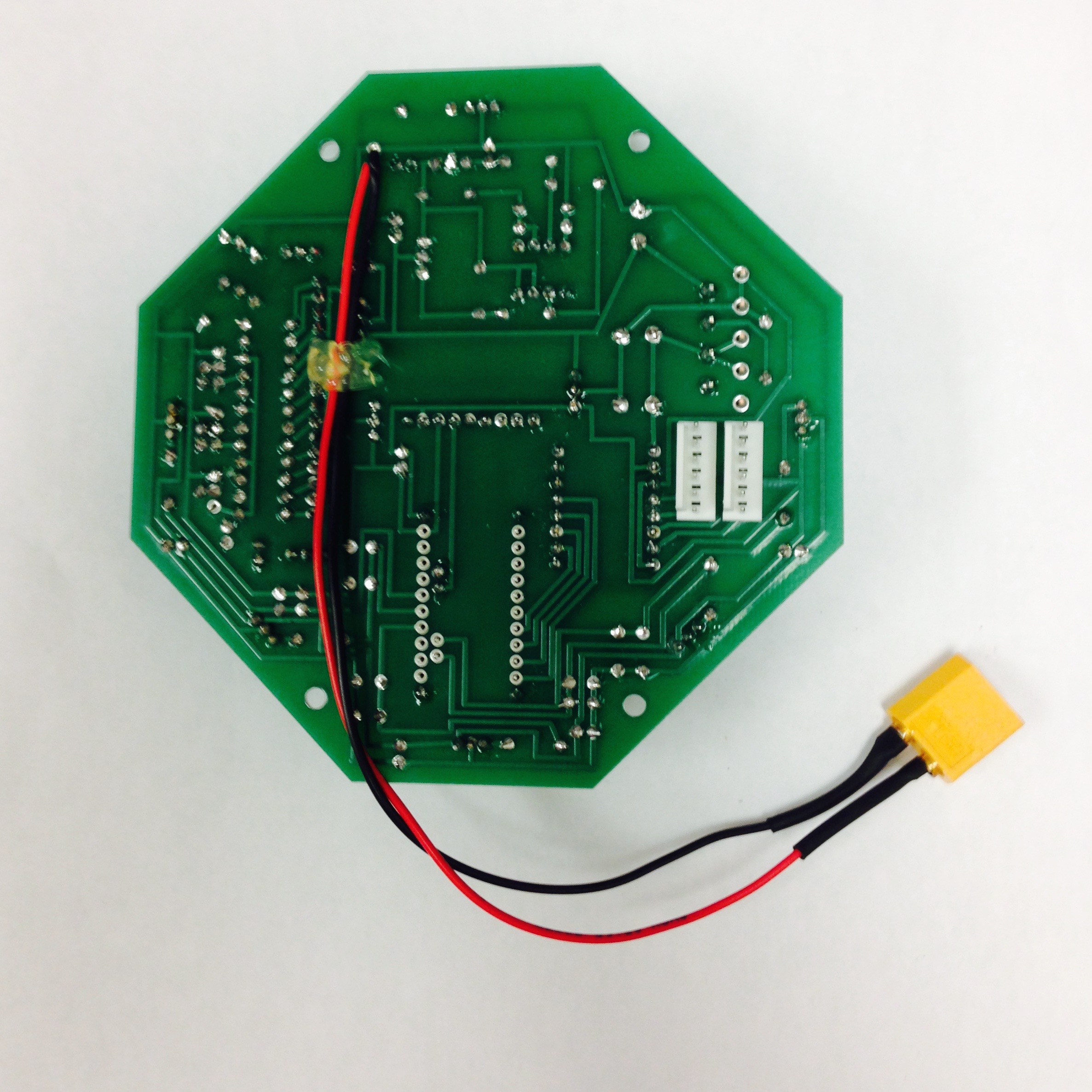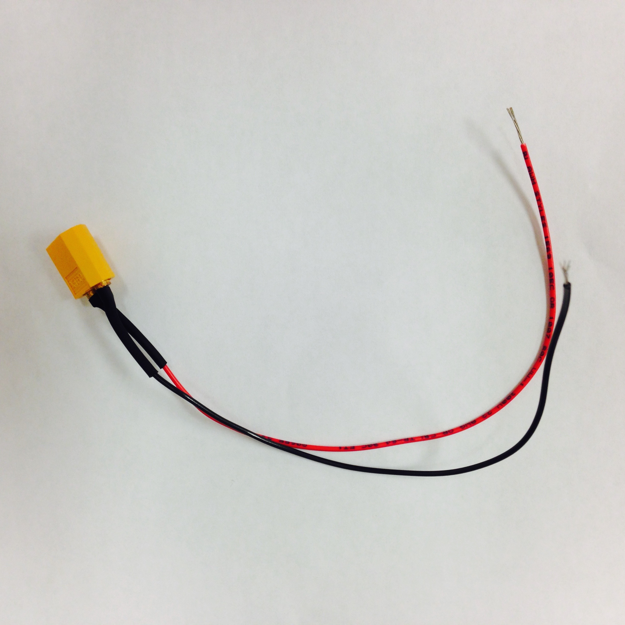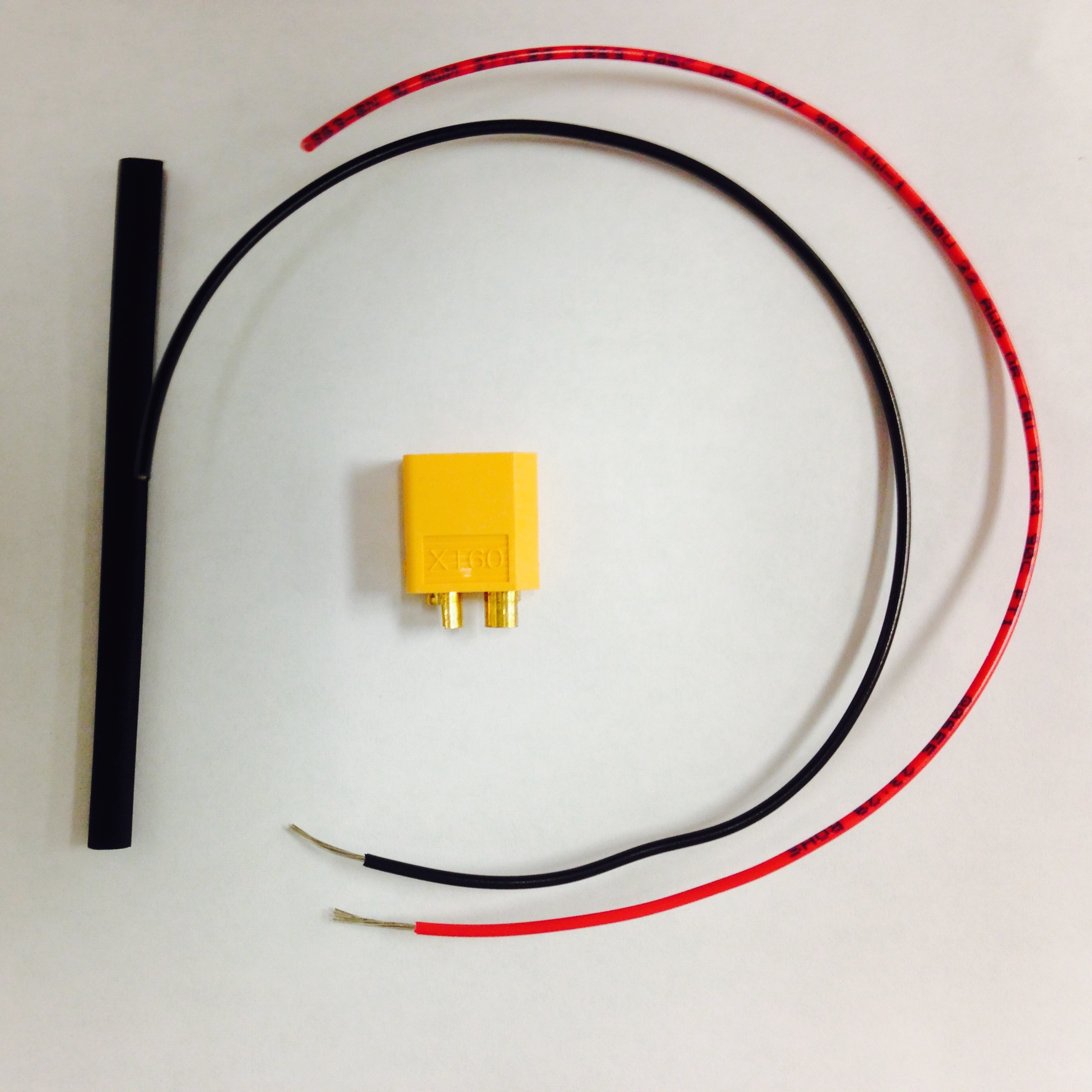 A power cable must be constructed. Figure 2.10 shows the stages involved in making the jumper cable. First, solder 22 or 20 gague red and black wires to the positive and negative leads of an XT60 male connector. Then, to insulate the leads, use heat shrink wrap to cover the newly soldered leads. Cut the red and black wires to the same length, strip the ends, and insert the wires into the two remaining holes on the PCB (marked $+$ and $-$). Make sure the positive XT60 socket is connected to the $+$ labeled hole and the negative XT60 socket is connected to the $-$ labeled hole. Lay the cable across the back of the board and solder the exposed wire into each hole. To resist wear and possible snapping of the wire at the PCB solder point, we will create a new pivot point for the wire on the board. With the wire pressed against the PCB use hot glue or some other stretchy adhesive to secure the middle of the wire against the board. We use hot glue seen in Figure 2.9(b).