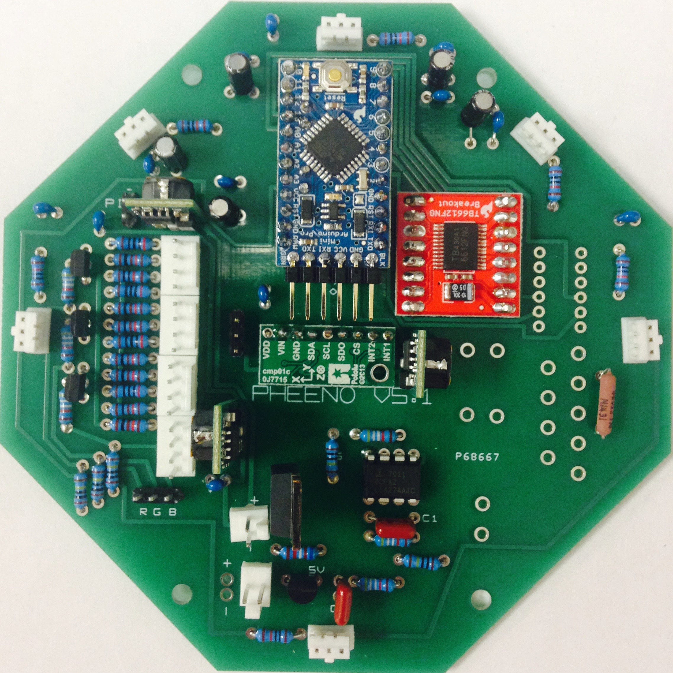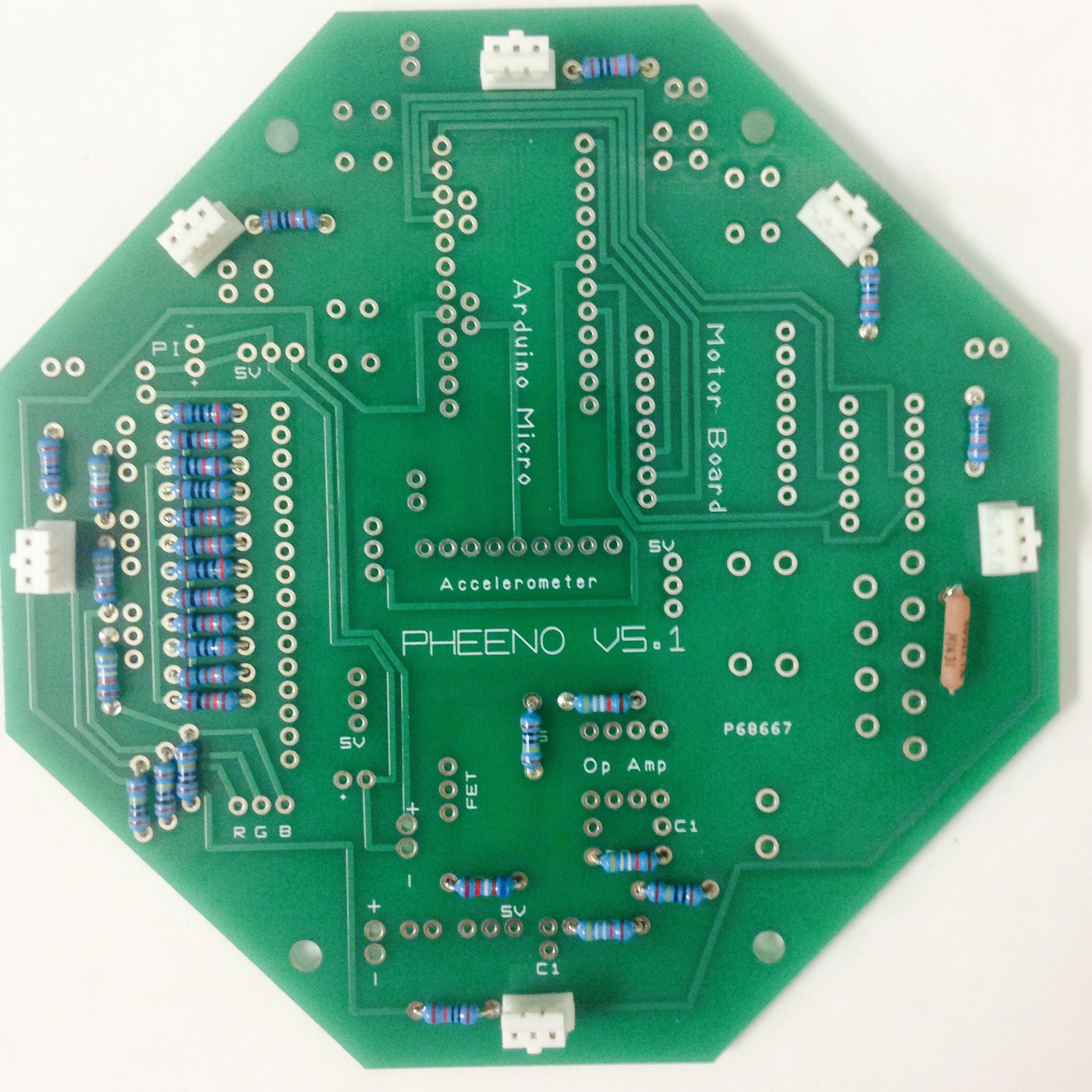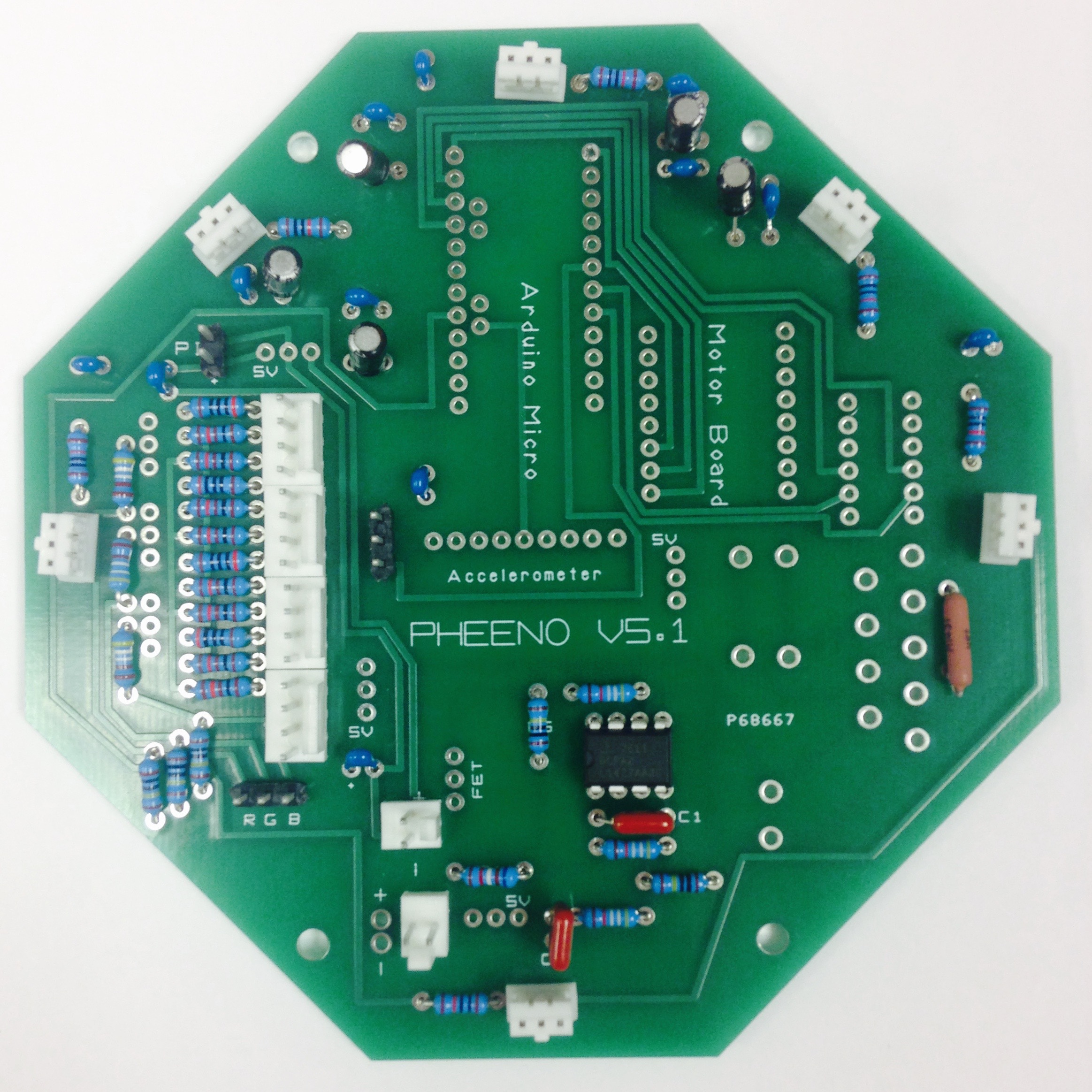 The first and possibly most difficult stage of the Pheeno construction is the assembly and soldering of parts onto the custom-designed printed circuit board (PCB). The A diagram of the PCB is shown in Figure 2.2; consult it carefully in conjunction with the pictures and descriptions below (an electronic schematic can be provided upon request). The population of the board takes approximately two hours, and the final result is Figure 2.1.