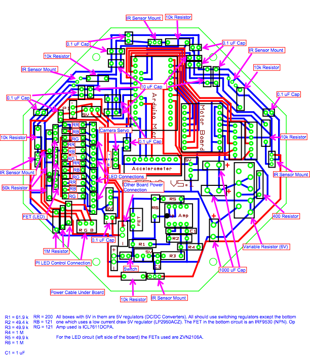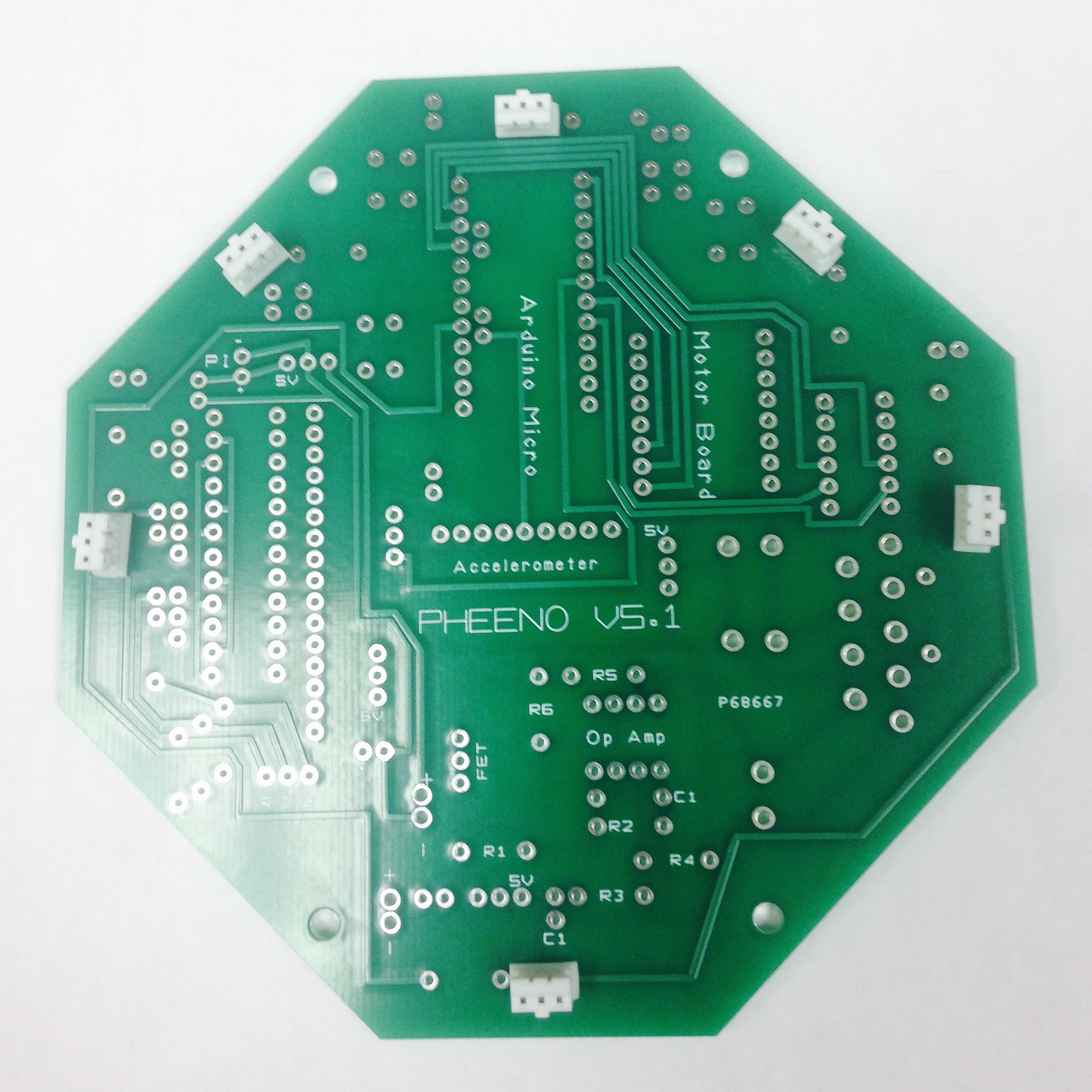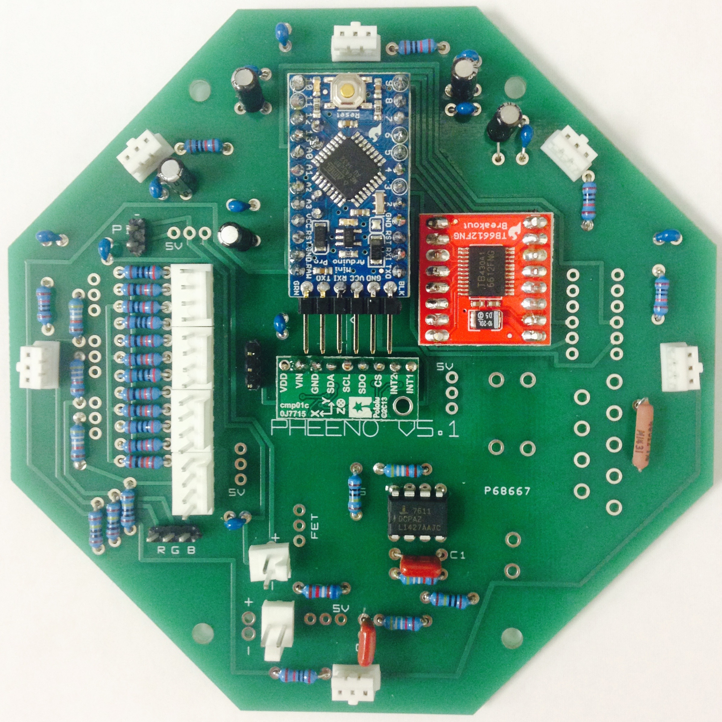 The first and possibly most difficult stage of the Pheeno construction is the assembly and soldering of parts onto the custom-designed printed circuit board (PCB). The A diagram of the PCB is shown in Figure 2.2; consult it carefully in conjunction with the pictures and descriptions below (an electronic schematic can be provided upon request). The population of the board takes approximately two hours, and the final result is Figure 2.1.
