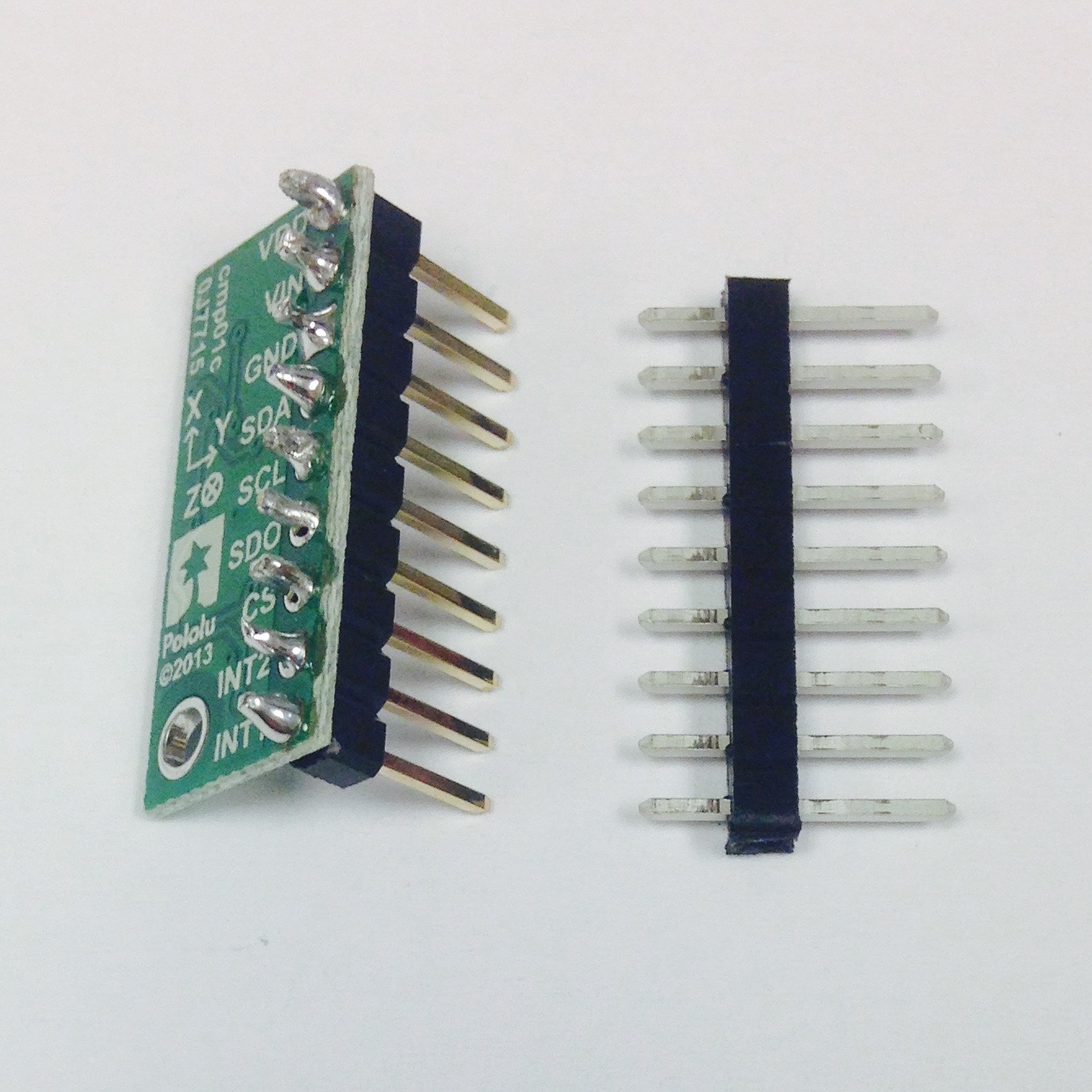 The trickiest part of the PCB may be soldering the attachments of the three boards, the Arduino Pro-Mini, the compass/accelerometer (also referred to as an IMU), and the H-bridge motor controller. The accelerometer is likely the easiest of the three to mount, so start there. Each accelerometer package comes with a set of pins, as can be see in Figure 2.6(a). The male header pins should be soldered such that the text is facing the soldered ends and the hole is in the lower right when looking at the soldered ends. Insert the board into the PCB such that it covers the “Accelerometer” text on the PCB, as seen in Figure 2.7. Balance the accelerometer parallel to the PCB and solder each hole. Clip off the excess length from the pins.