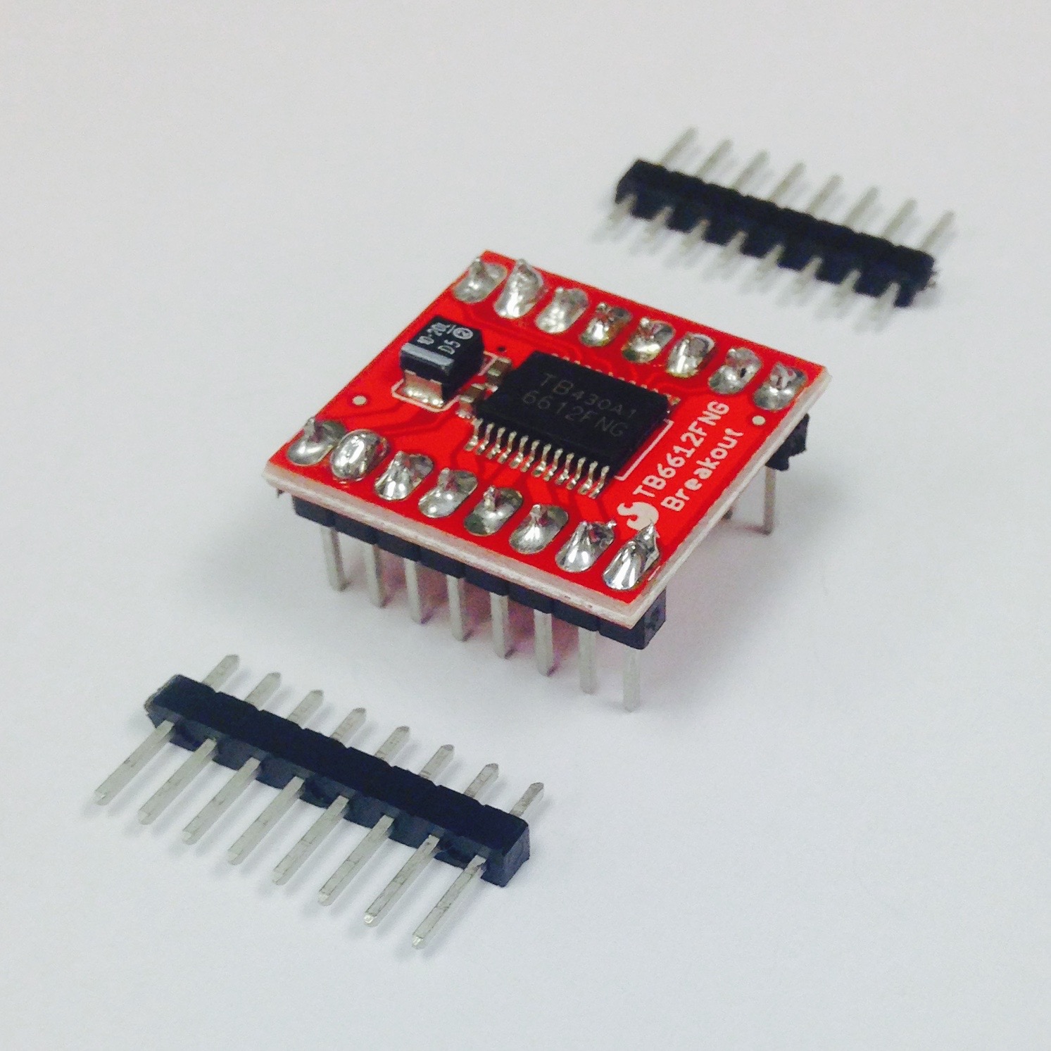 The H-Bridge motor controller is the red board, as seen in Figure 2.6(b). Clip off two sets of 8 male header breakaway pins and insert them into the PCB. The pins should be put through such that the chip on the board is facing the side soldered. Insert the board into the PCB such that the larger chip faces the top the PCB as seen in Figure 2.7. Flip the PCB over and solder the motor board to the PCB.