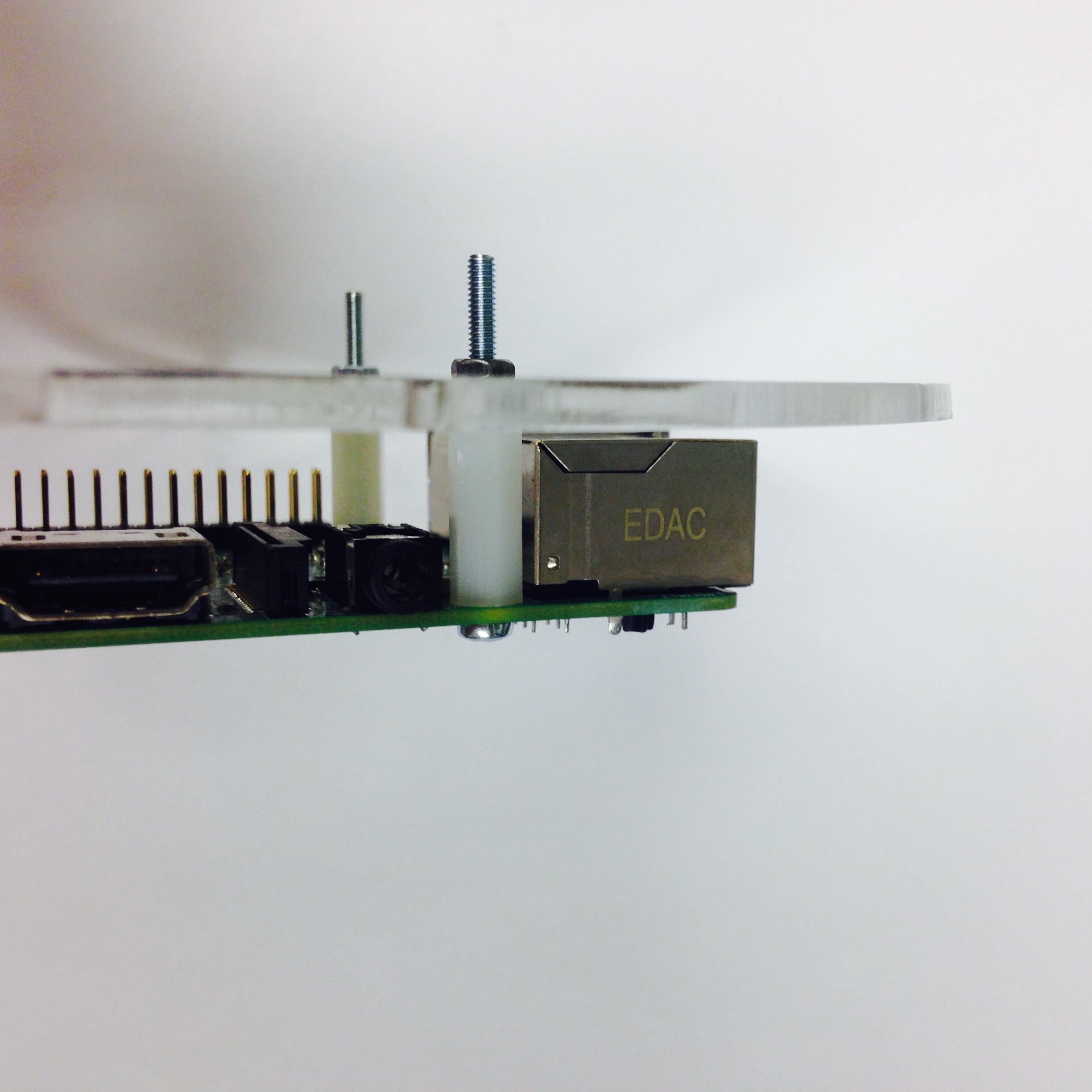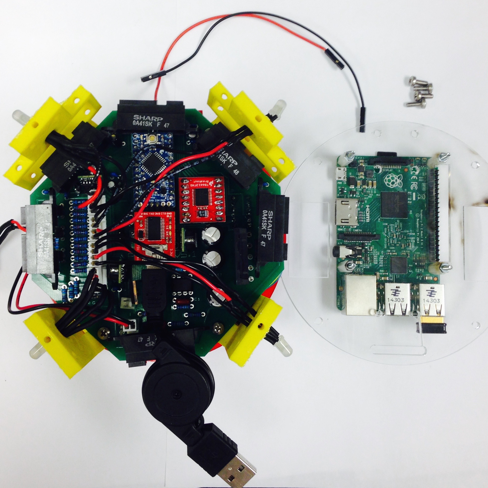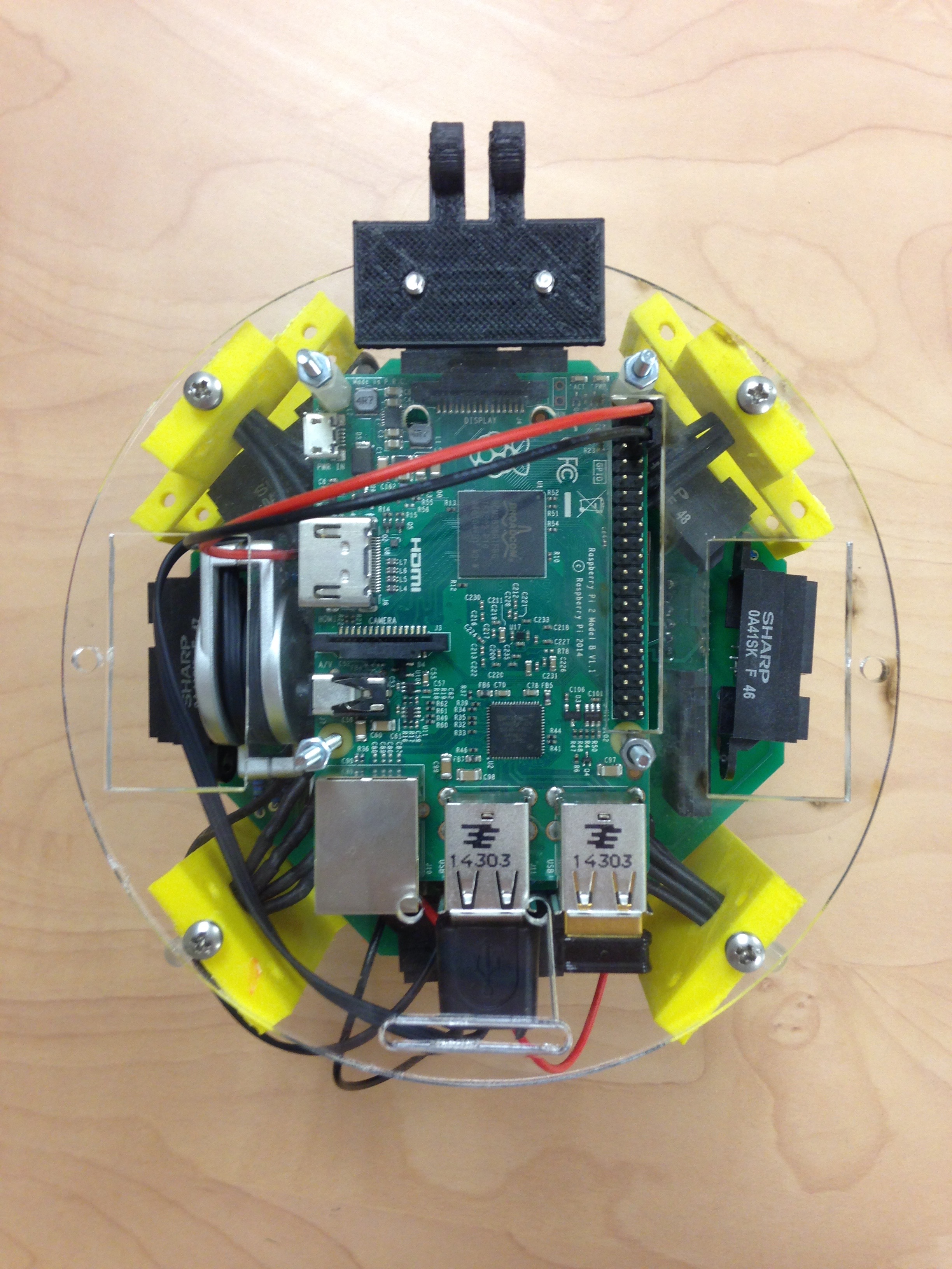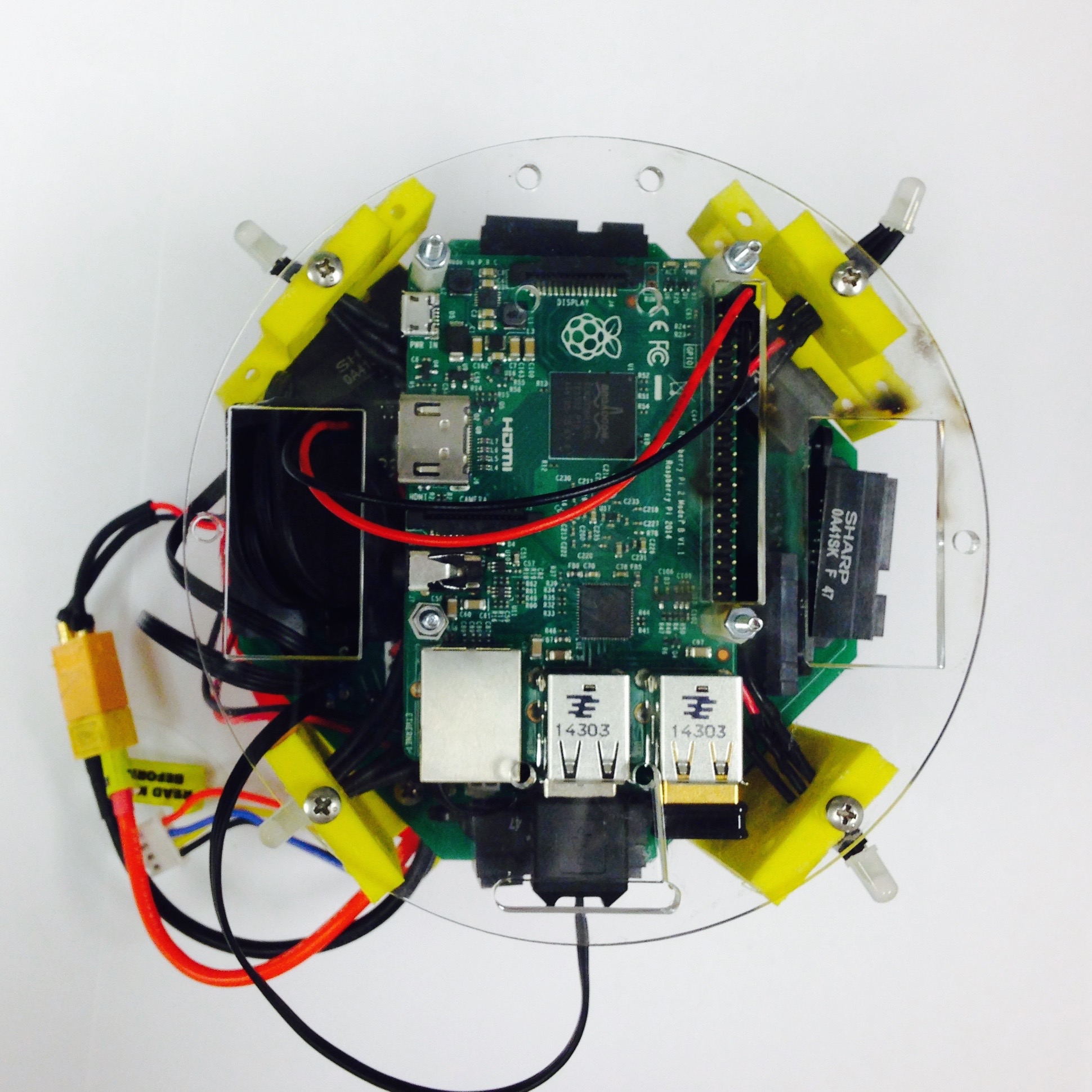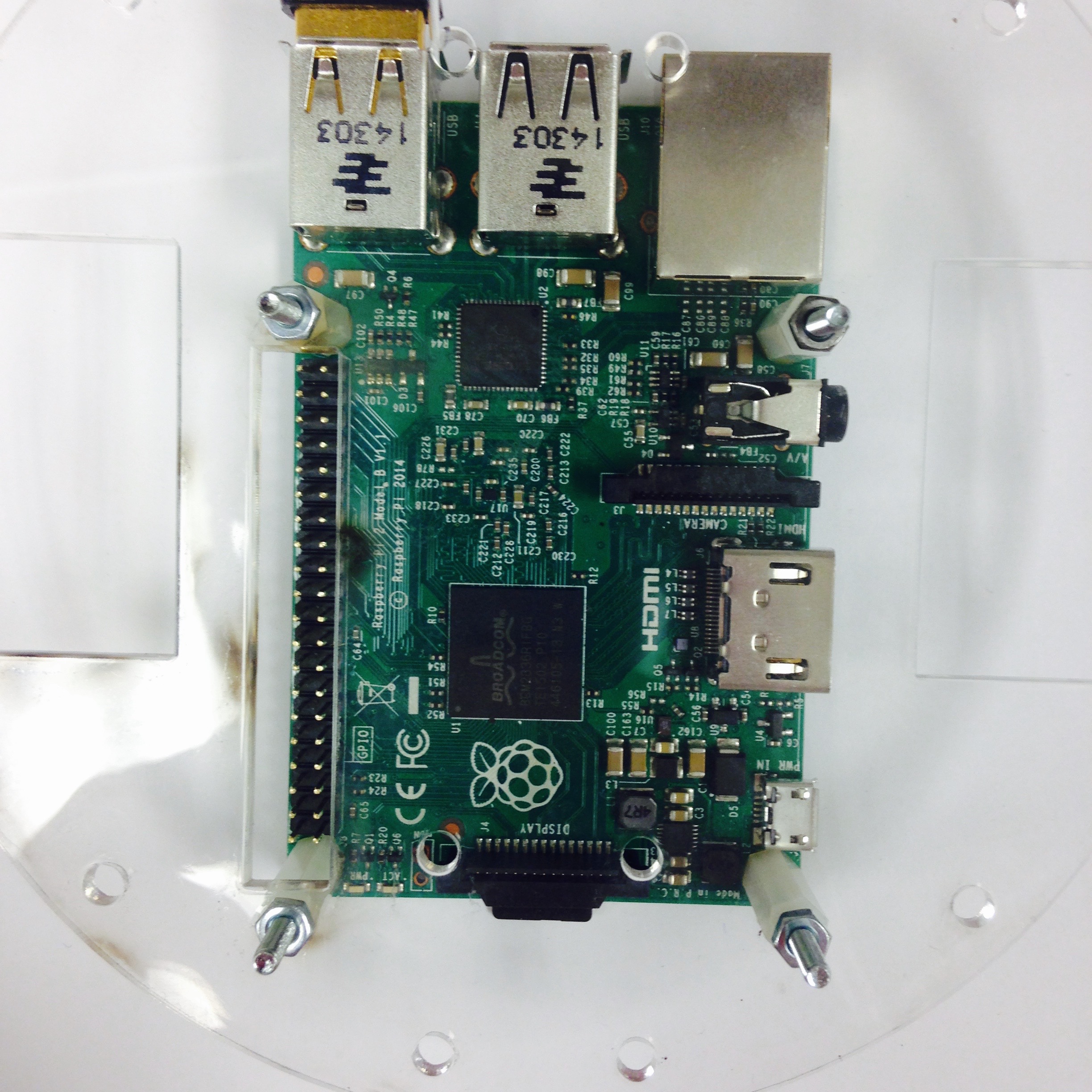 The Raspberry Pi is a small, linux computer developed for educational purposes. It often serves as the brains of DIY projects, and in the case of Pheeno is a practical means for doing high level computations like image processing and controller algorithms. The Pi attaches on the underside of the acrylic plate with the GPIO (General Purpose In-Out) pins aligned with the slot in the plate, as seen in Figure 5.1(c). The holes in the plate should align with the mounting holes in the Pi. Using four bolts, nuts, and 1in nylon spacers, fasten the Pi securely as seen in Figures 5.1(c) and 5.1(d).