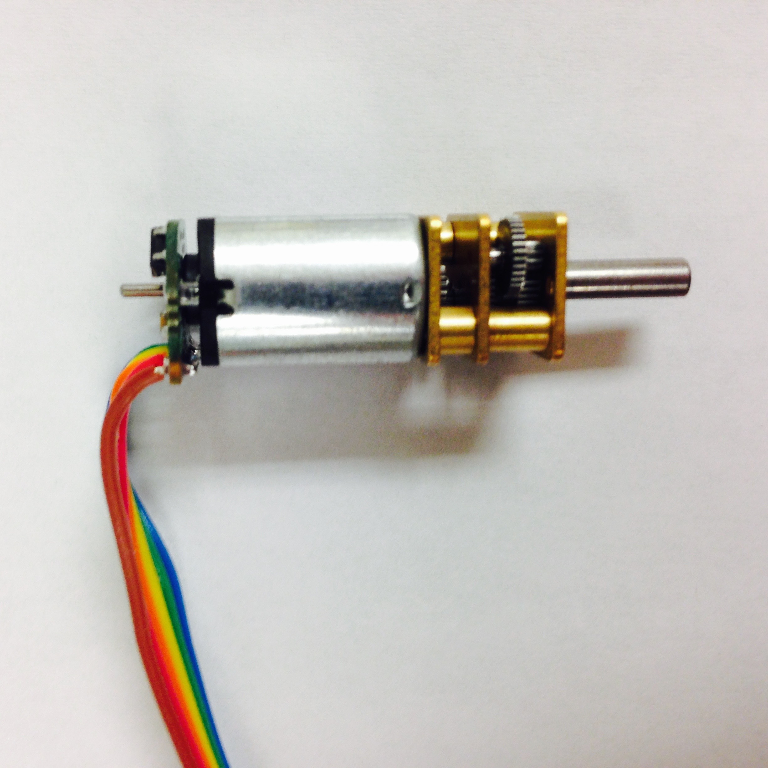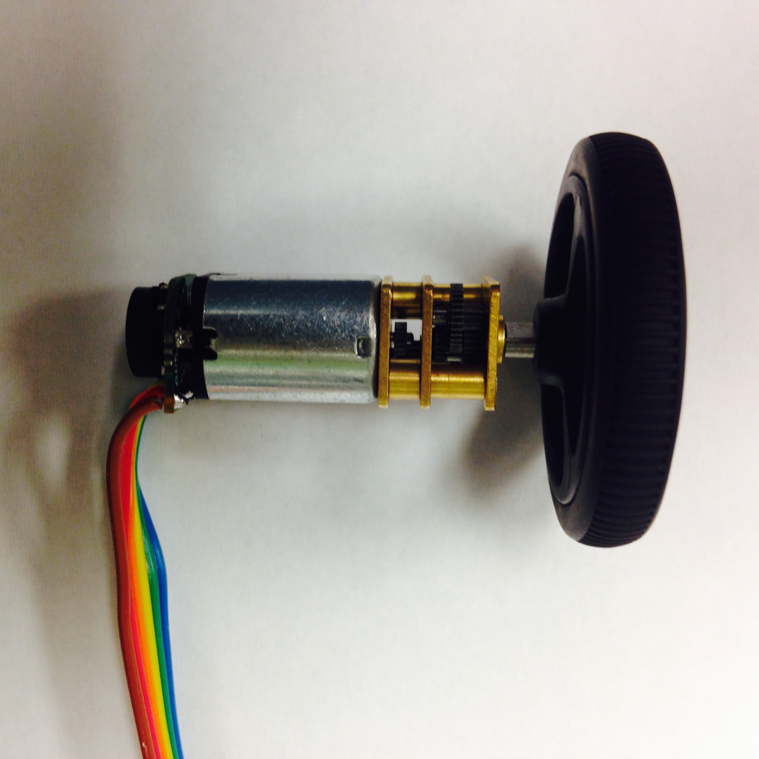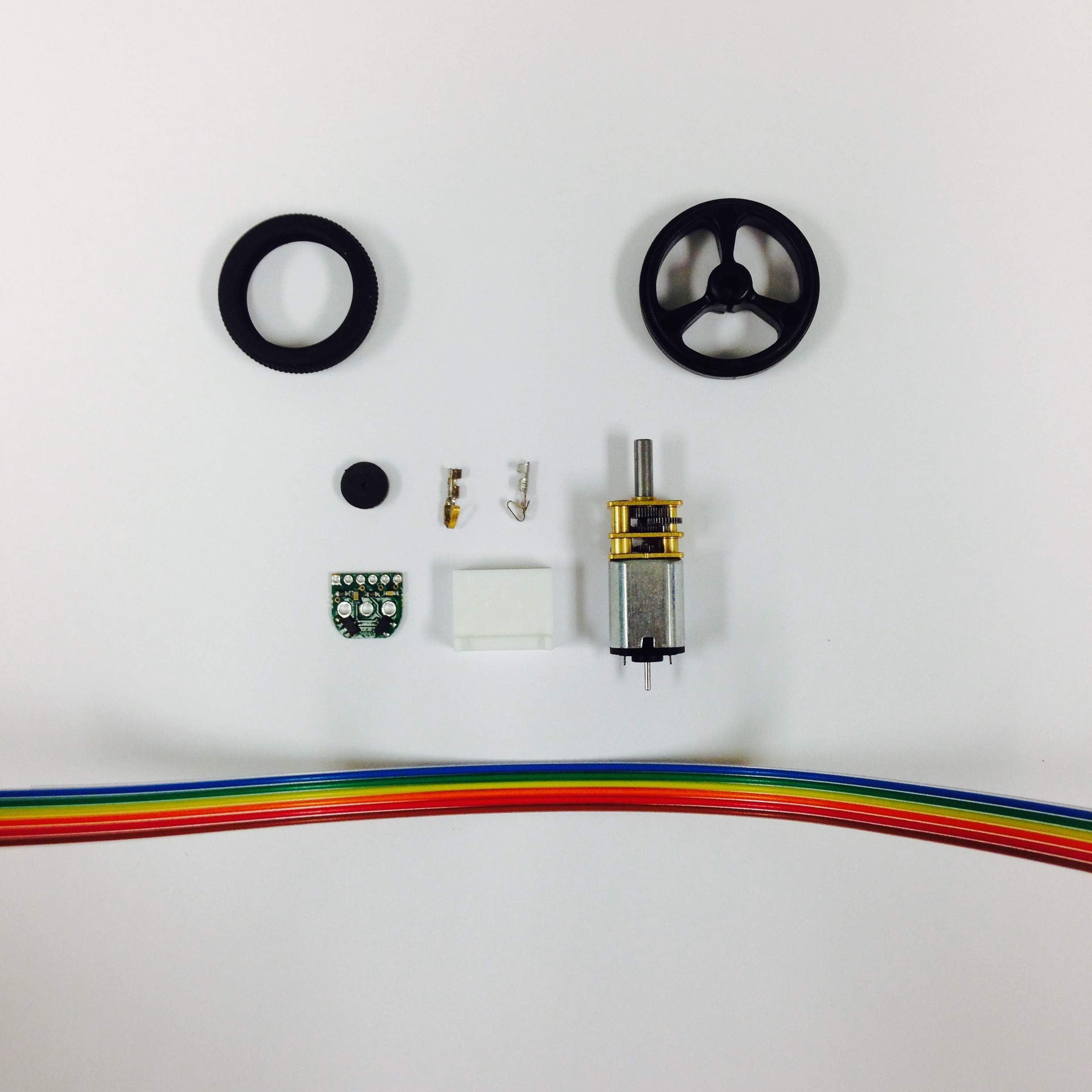 The fabrication of the motor/encoder/wheel assembly requires some of the most precise soldering necessary in the course of constructing Pheeno. The first step is to gather the parts and understand their function and behavior. The parts for assembly can be seen in Figure 3.1(a) (Note: This picture does not contain all of the female connection terminals). The $50$:$1$ micro gear brushless motor is very small with a small extended motor gear shaft out of the back which will be used for the encoder readings. The magnetic encoder PCB consists of the small green board and associated magnet; this PCB relays voltages to the motors and records the rotations of the extended gear shaft using Hall sensors. The ribbon cable connects the encoder to the main PCB on Pheeno.