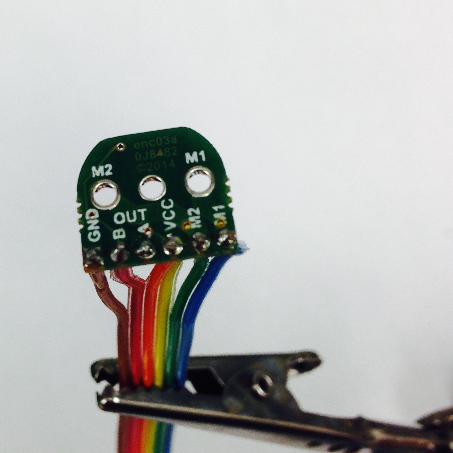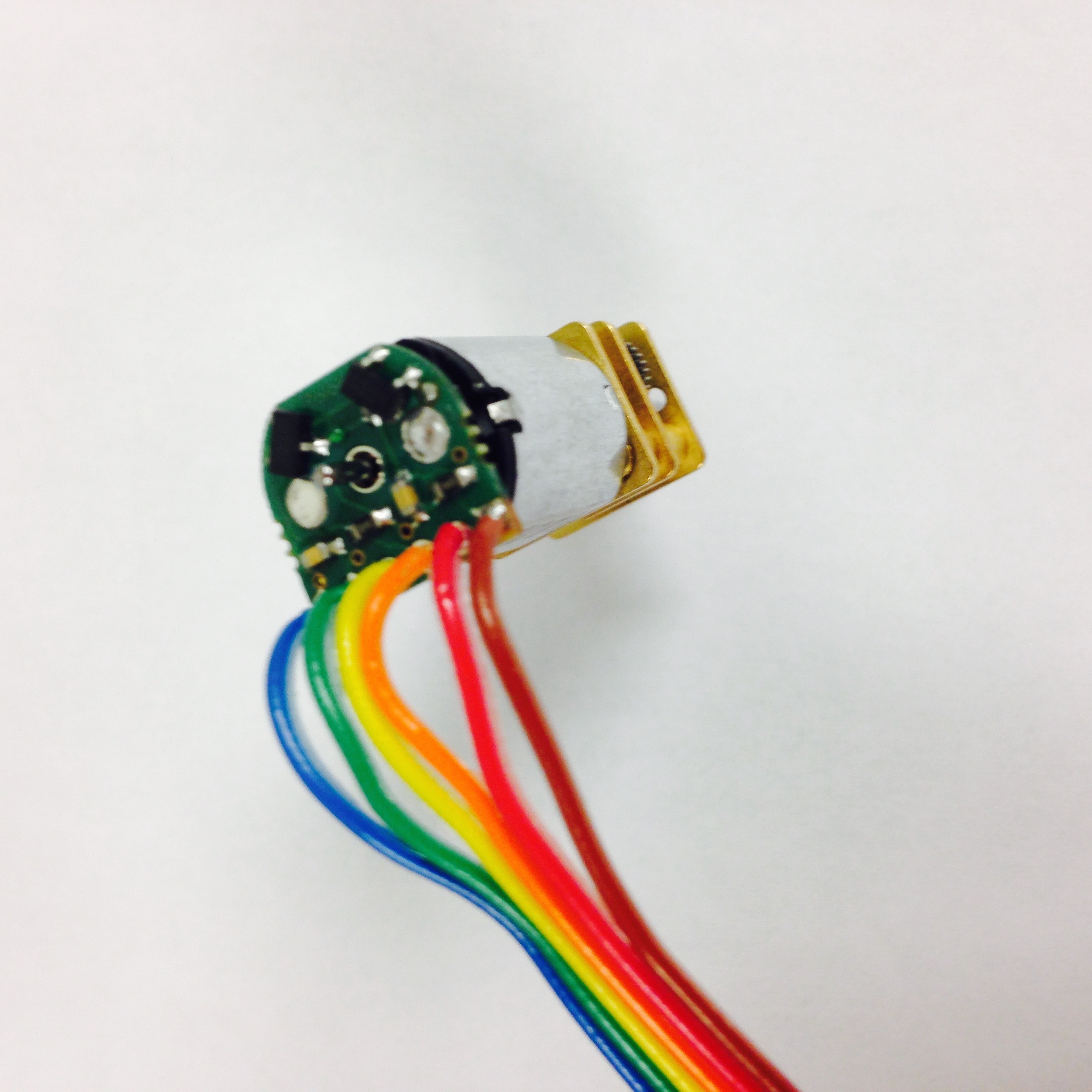 As seen in Figure 3.1(b), carefully solder the ribbon cable to the encoder board. The cable should be soldered to the text side of the board, with the brown wire soldered in the hole labeled GND. If you are using different colored wires, make sure the wires are connected the same way as displayed in Figure [3.1](pheeno_construction_content#fig3_1a). In addition, the wires should bend away from the center of the board, to allow the magnet room to rotate. The board itself can now be soldered onto the motor. The wires should run away from the motor chassis and the words stamped on the motor should be on the same side as the wire leads, as seen in Figures 3.1(c) and 3.1(d). Two pins atop the motor fit into the large holes in the board. Make sure the board lies flat and parallel to the motor when soldering. A trick to do this is to solder one terminal then keep it warm such that the solder is still liquid and reposition the board with pliers. BE CAREFUL NOT TO BURN YOURSELF DOING THIS! YOU DON'T NEED TO USE YOUR FINGERS YOU CAN USE PLIERS! I AM NOT RESPONSIBLE FOR YOU TOUCHING LIQUID SOLDER OR THE IRON!.