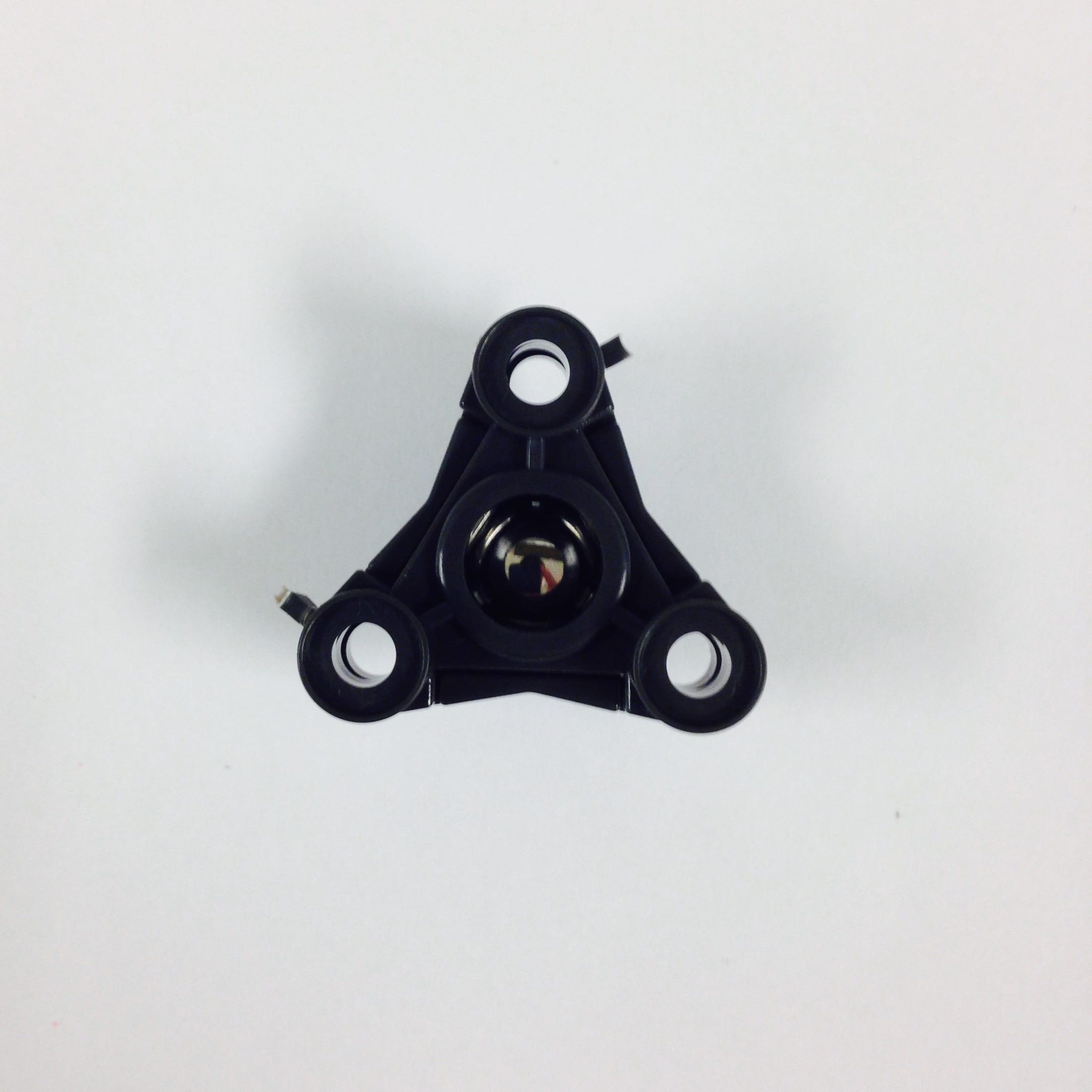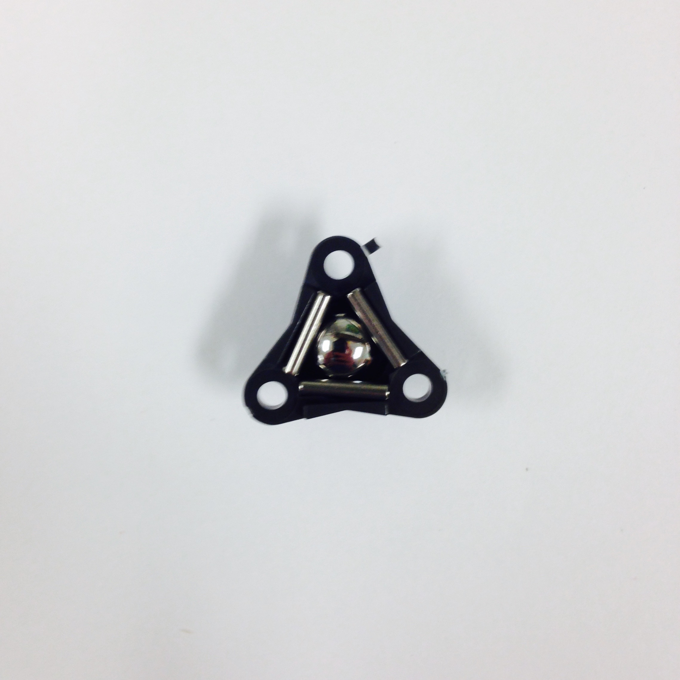 First, assemble the Pololu casters. The process can be seen in Figure 3.3 and will be referred to through this paragraph. Place the triangular black piece flat on the table with the opening facing out and insert the metal ball, as seen in Figure 3.3(a). Next insert the three tiny metal rods that keep the ball in place, as shown in Figure 3.3(b). Lock the loose components in with the flat triangular piece, shown in Figure 3.3(c). The ball should feel secure but still have a full range of motion without resistance. Screw the assembly onto the triangular extrusion on the chassis mount, as seen in Figure 3.3(d). Repeat these steps for a second caster, then attach it it on the opposite end of the 3D printed part, shown in red in Figure 3.3(d).