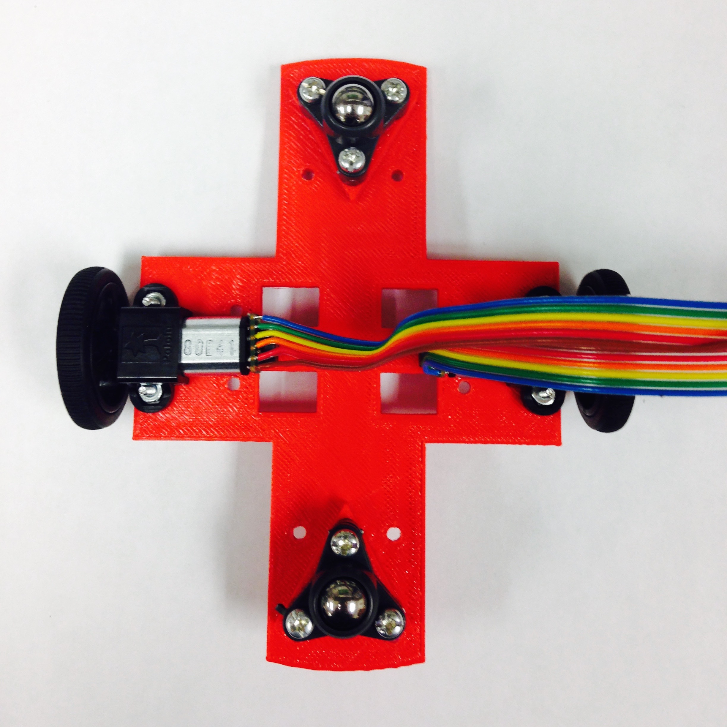 Now that the two motors are complete, they can be mounted to the chassis. Using a 3D printer, print the cross-shaped chassis component. Once the part is finished, make sure to remove the raft from the printed component; this extra bit of extruded plastic is not part of the mechanical design. Ream the holes to clear excess plastic.
