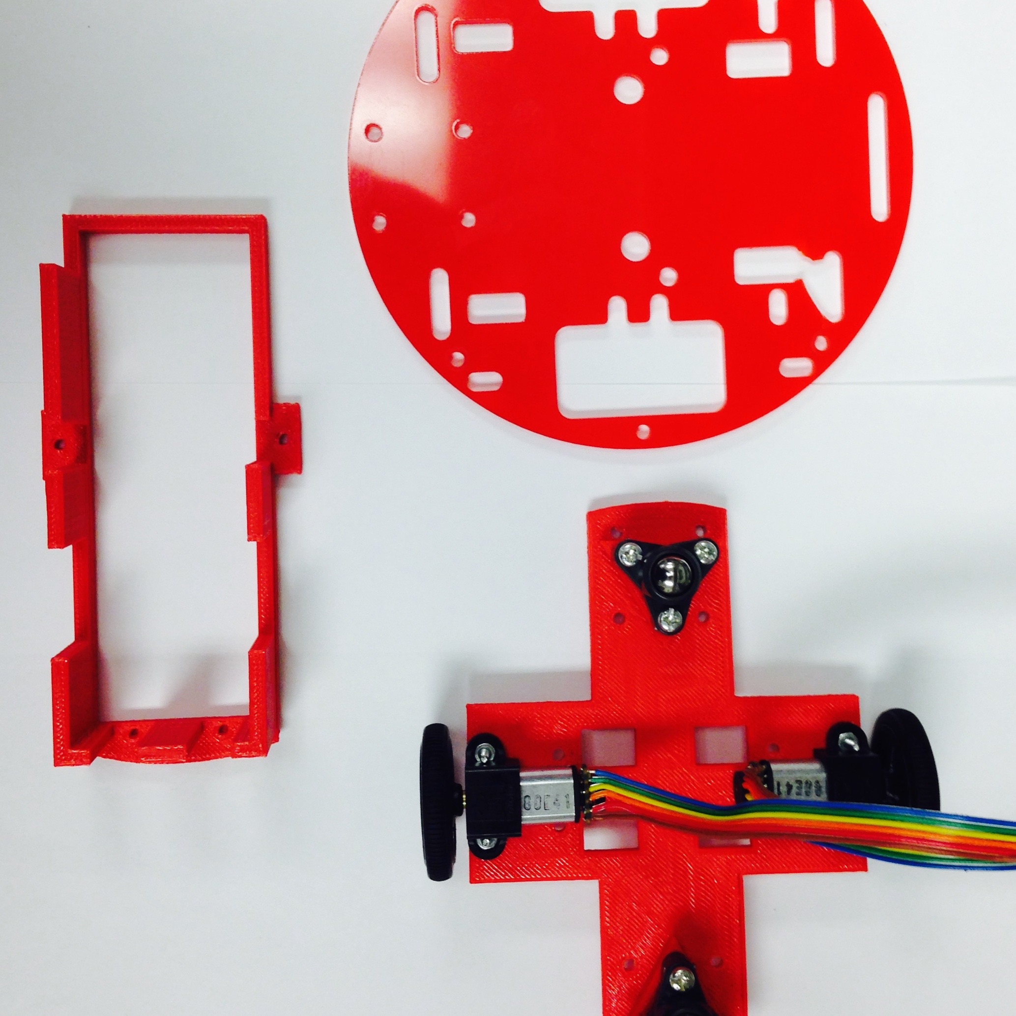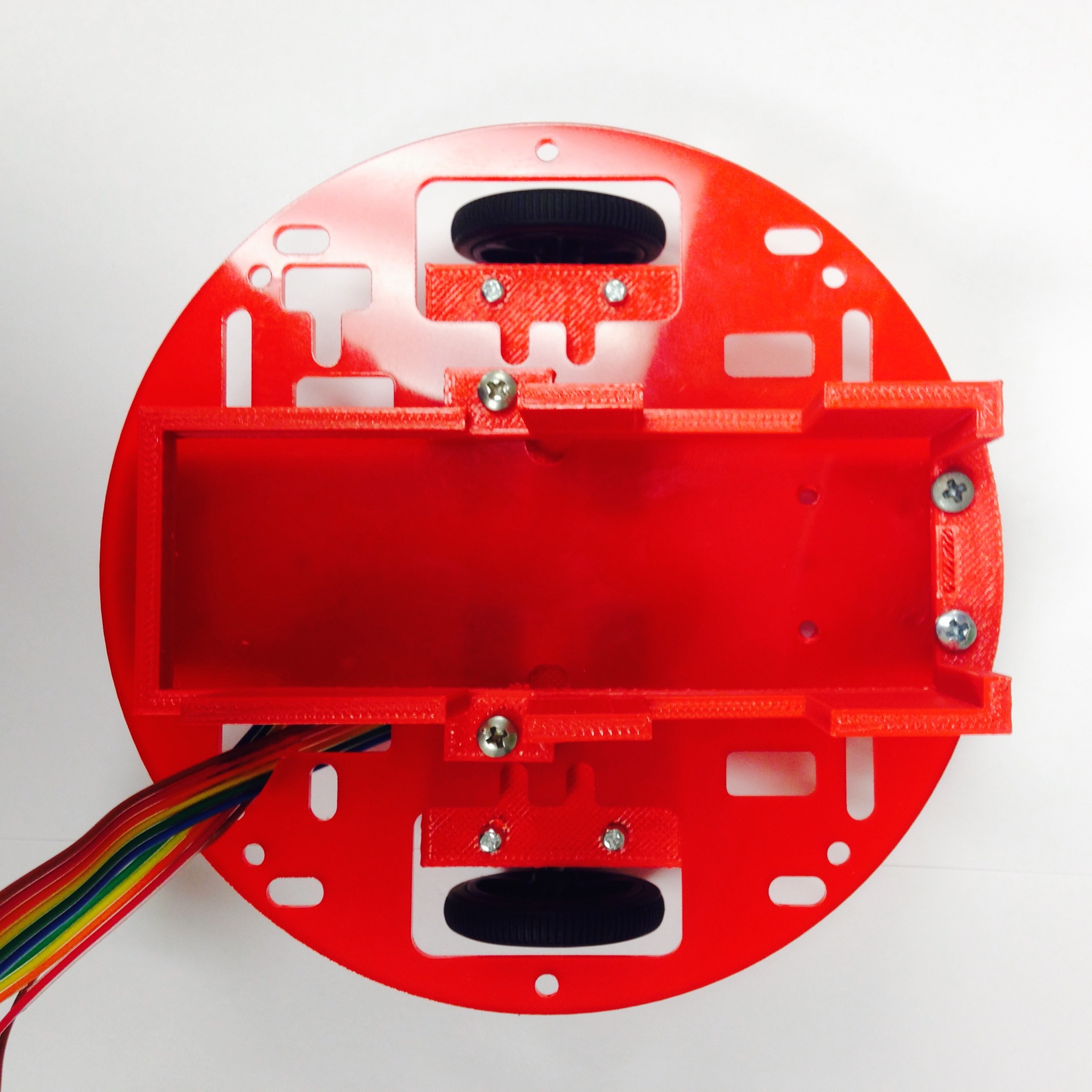 We are close to being done with the chassis and full assembly! The only two components left are the Pheeno base board (a laser-cut acrylic disc with slots in it), and the 3D printed battery bracket. Note that the bracket can be rather fragile, so take care not to snap off the protruding tabs!