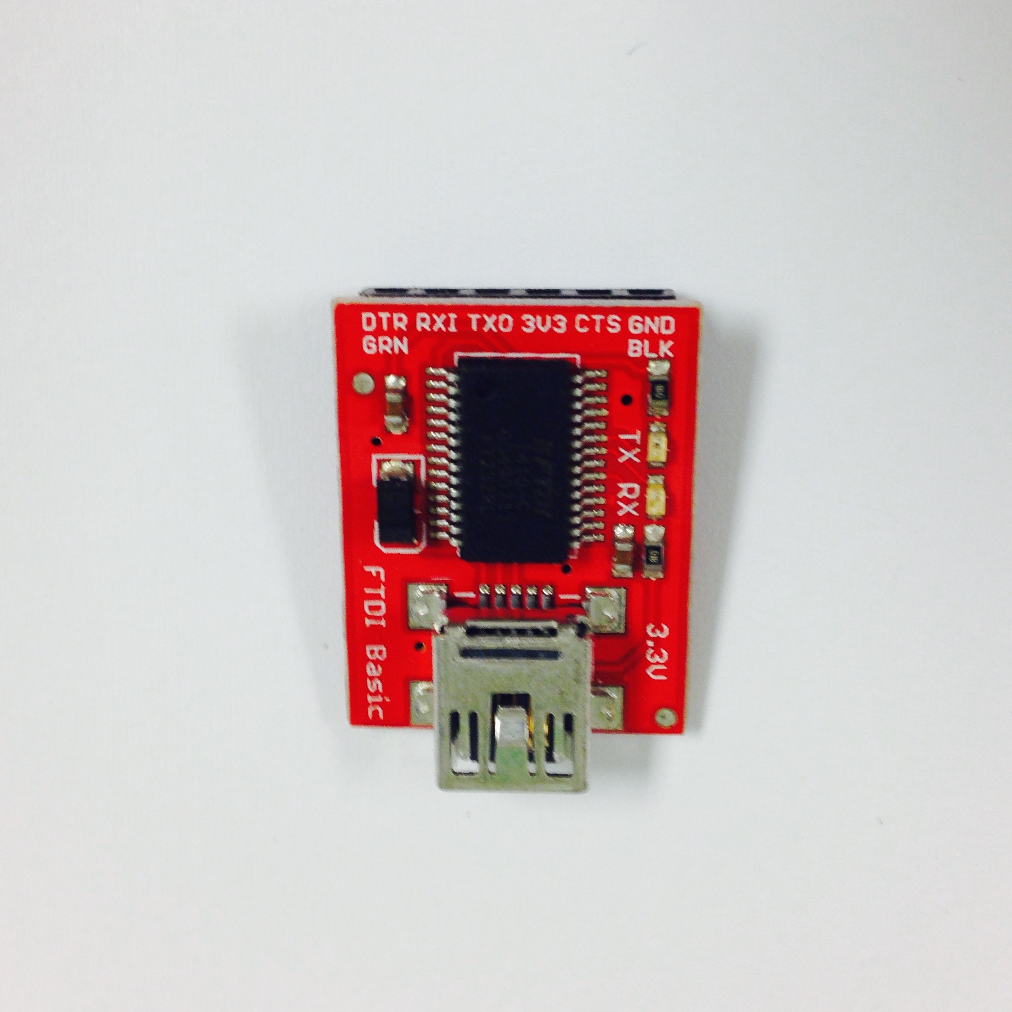 The last step for constructing the interior of the bot is to attach the FTDI board, shown in Figure 4.7. This board is a USB-to-Serial integrated circuit and serves to allow communication between the Arduino Pro Mini and the Raspberry Pi. It also allows the Raspberry Pi or an external computer program the Arduino Pro Mini. Connect a micro-USB to USB cable to the FTDI (Figure 4.7(b)), then connect the board to the male header pins on the Arduino (Figure 4.7(c)). The orientation can be seen in Figure 4.7(d).