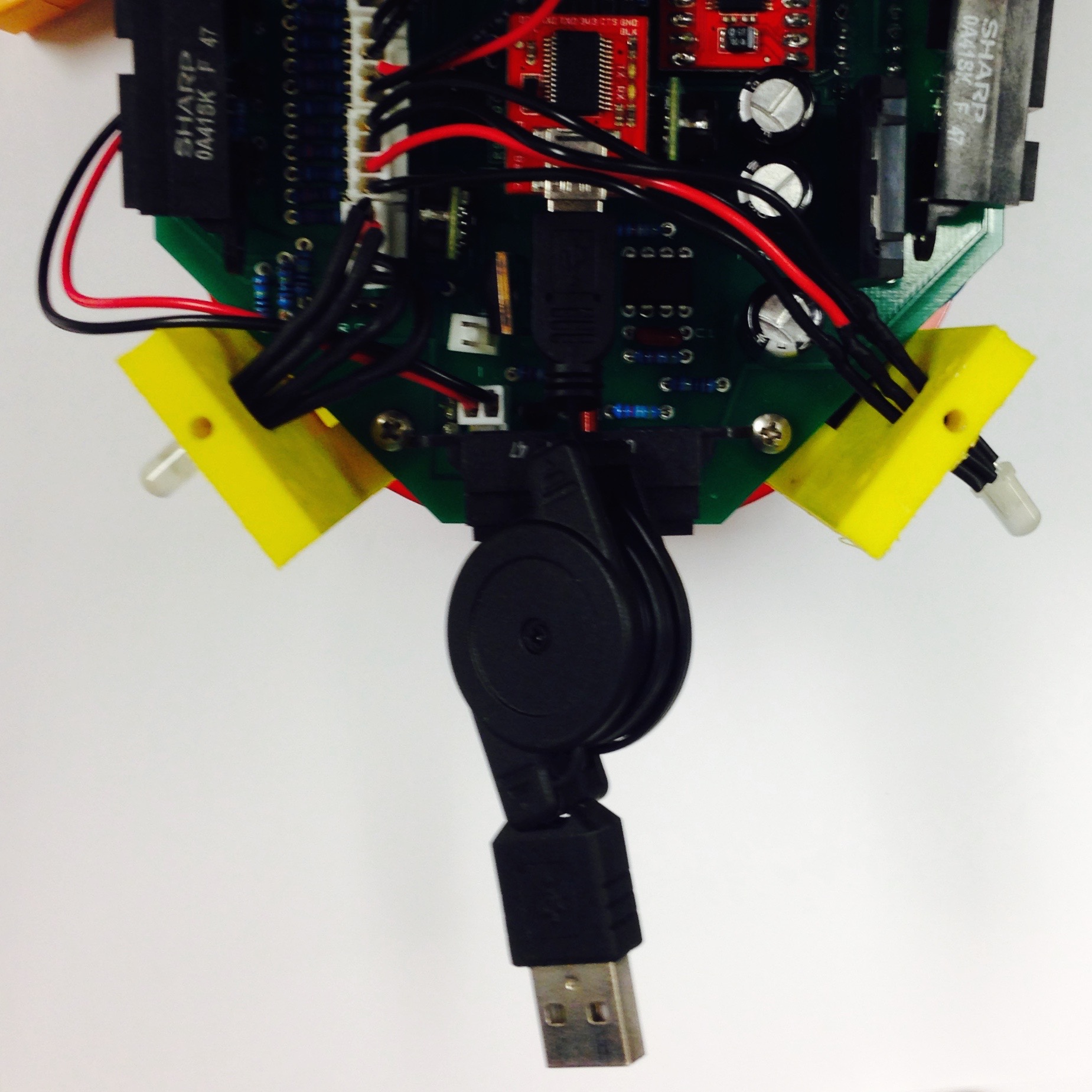 The first step of Section 2, in constructing the PCB assembly, was to insert the six IR mounts. It is now time to attach the six associated infrared sensors. Figure 4.6(a) displays the location of the six sensors from an overhead view, with five oriented on the front and sides of Pheeno. It is necessary to clip the “ears” off the IR sensors to fit all of them side by side. The last sensor fits in the rear, next to the switch cable. Figure 4.6(b) shows a head-on view of Pheeno with the sensors inserted.