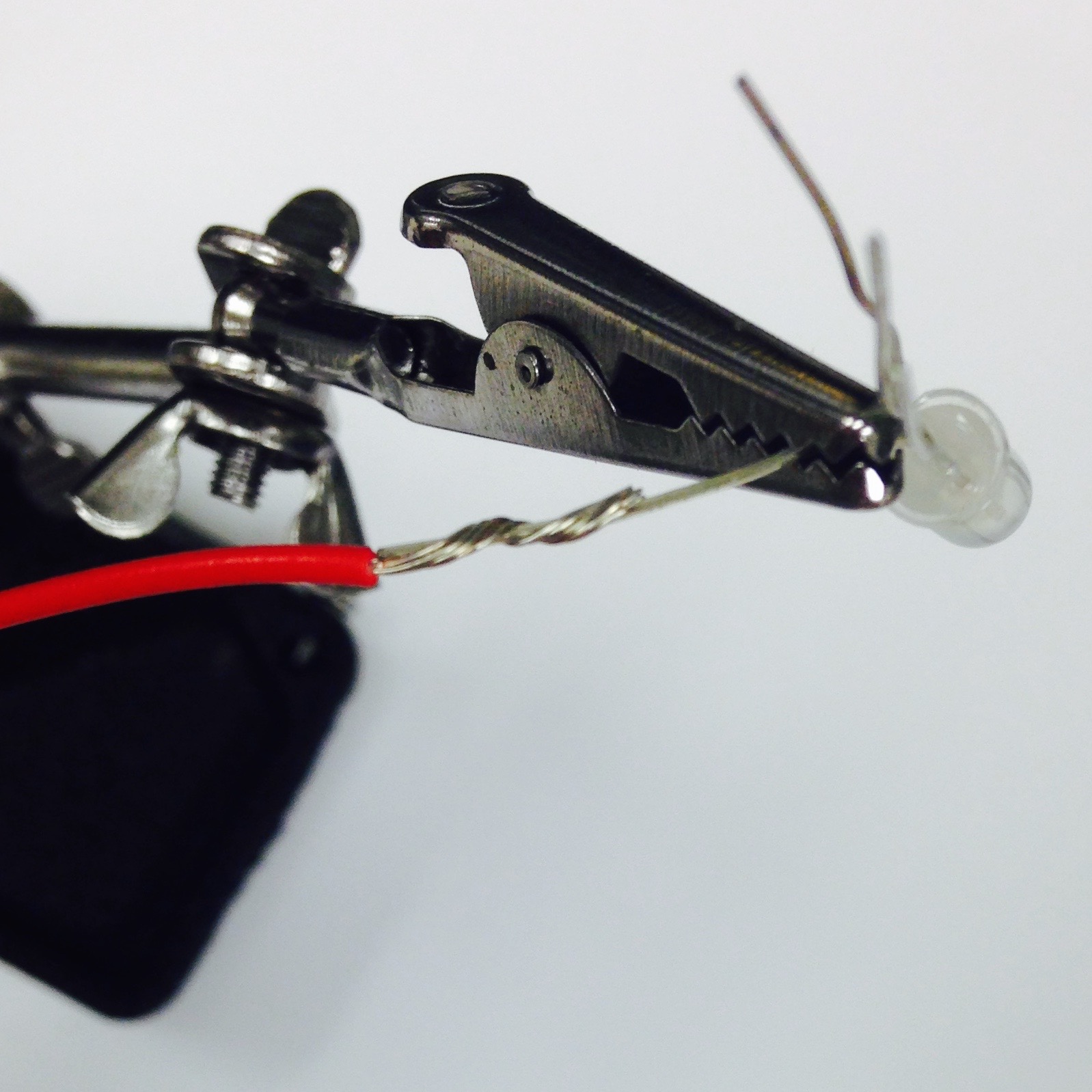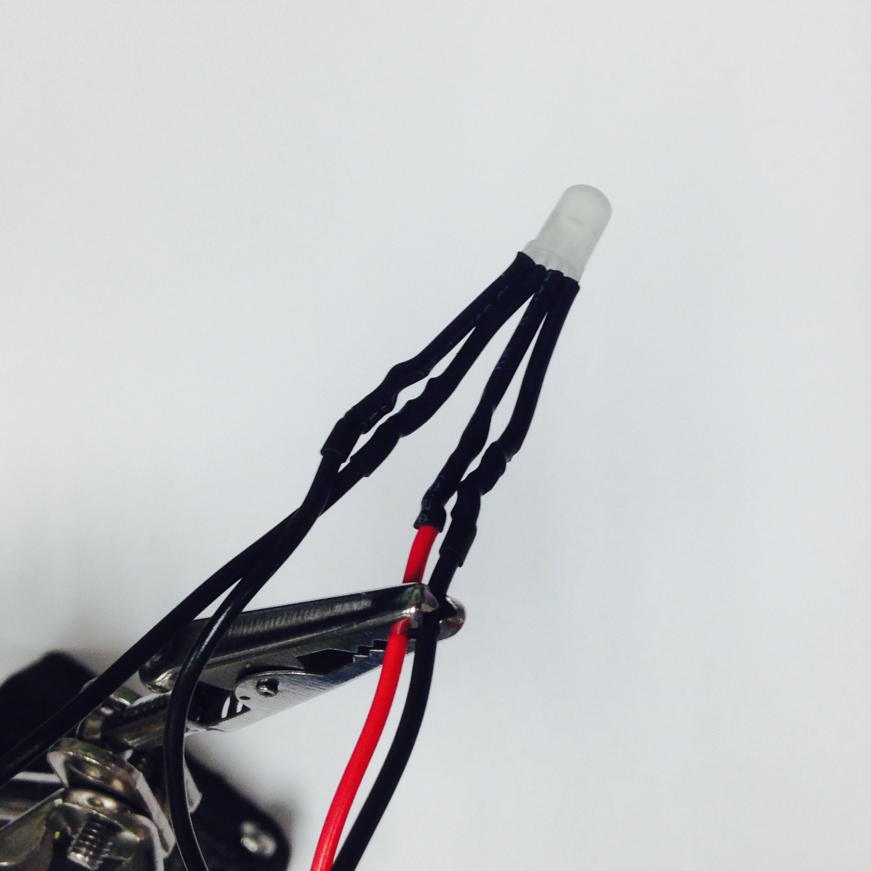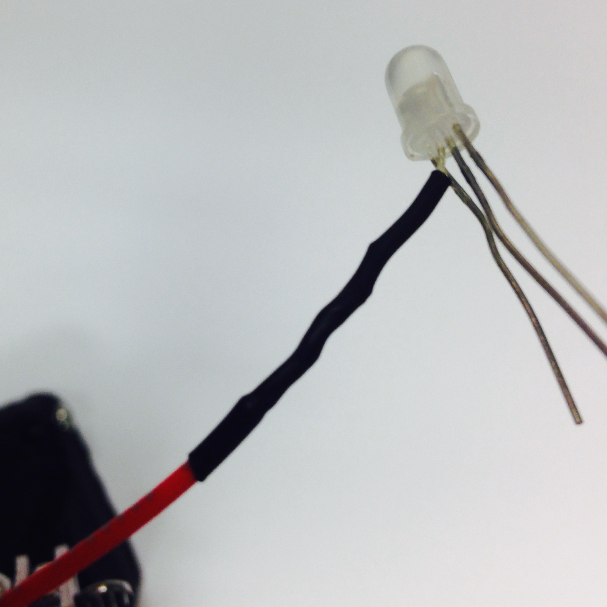 Take the long lead of an LED bulb and wrap the stripped end of a 3in piece of red wire about it to make a solid physical connection (Figure 4.4(b)). This is a similar technique as if you were soldering two wires together. Solder this connection together by carefully coating the twisted connection (Figure 4.4(c)). Cover the exposed wire with a similarly sized length of heat shrink wrap (Figure 4.4(d)). The result can be seen in Figure 4.4(e). Repeat the process with black wires for the other three leads. The finished result is shown in Figure 4.4(f).