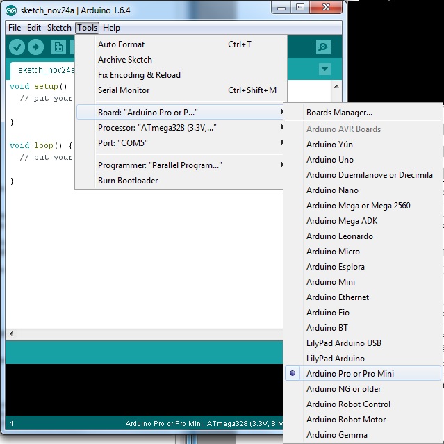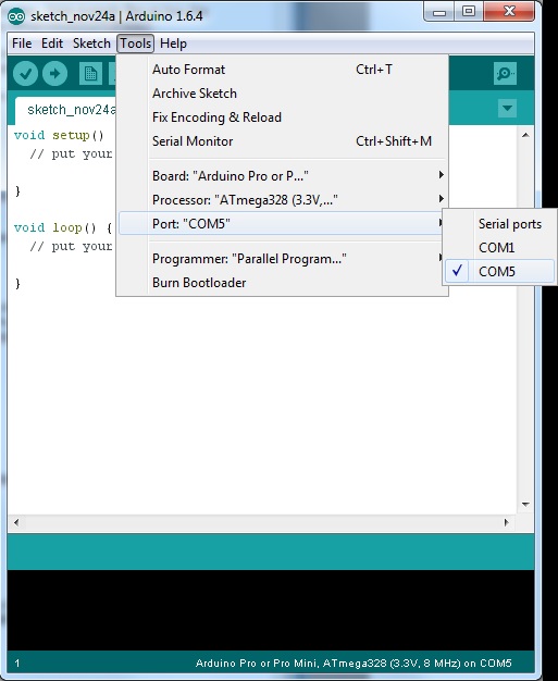 Next, go to the Tools tab of the Arduino software and change the processor to the ATMega328 (3.3V, 8MHz) as seen in Figure 1(b).