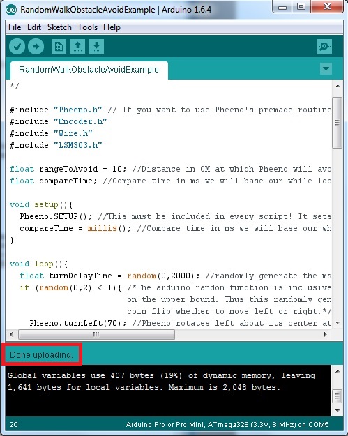 Now the Arduino software knows what type of board to talk to and through what port. So now you can upload any code you want! To test this all out let’s upload an example script that will be explained later. Go to File –> Examples –> Pheeno –> RandomWalkObstacleAvoidExample. This should load a premade script if you have done everything in “Installing the Pheeno Libraries” section correctly. Now click the arrow in the upper left hand corner of the Arduino software to upload it to the robot. NOTE: THIS SCRI#PT MAKES PHEENO RUN AROUND RANDOMLY! MAKE SURE YOU'RE HOLDING THE PLATFORM SO IT DOESN'T RUN OFF THE TABLE OR MAKE SURE THE ROBOT IS OFF WHILE UPLOADING! When the Arduino software says “Done uploading”, as seen in Figure 1(d), you can disconnect the robot and let it run around.
