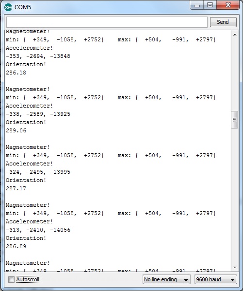 Once uploading the script do not unplug the USB cord from the computer. Turn on the robot and open the serial monitor in the Arduino software. There should be numbers scrolling across the screen like in Figure 3. The first set of numbers under the “Magnetometer!” line are two vectors of the min and max readings of the magnetometer along the {x, y, z} axis. The second set of numbers under “Accelerometer!” are the averaged accelerometer measurements along the x, y, z axis. The last set of numbers under “Orientation!” is the current direction the robot has measured facing with respect to magnetic north (in degrees!).